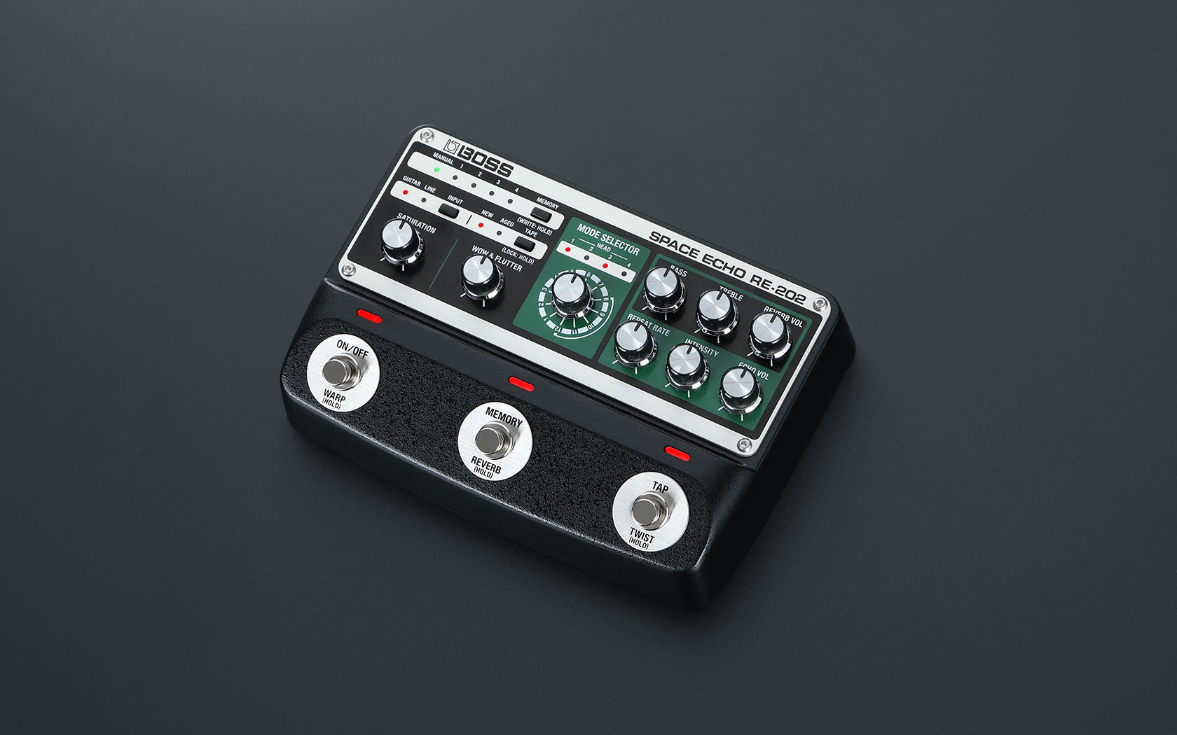Realized through the latest technologies and exhaustive analysis of several vintage RE-201s—including a pristine original unit from the BOSS and Roland factory archive—the RE-202 brings the complete Space Echo experience to life in a versatile modern pedal.