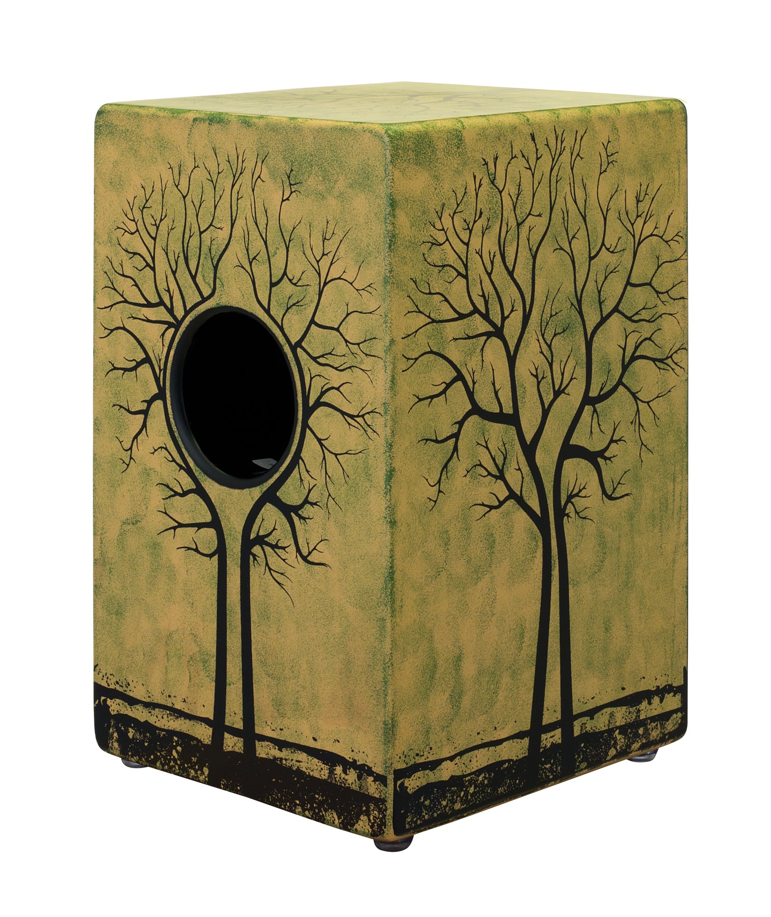 The Tree of Life cajon features a hand painted and silkscreen design that wraps around three sides and depicts the Tree of Life.